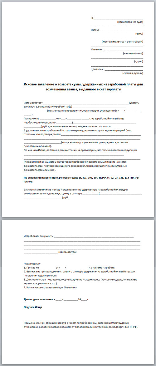 Исковое заявление о возврате сумм, удержанных из заработной платы для возмещения аванса, выданного в счет зарплаты